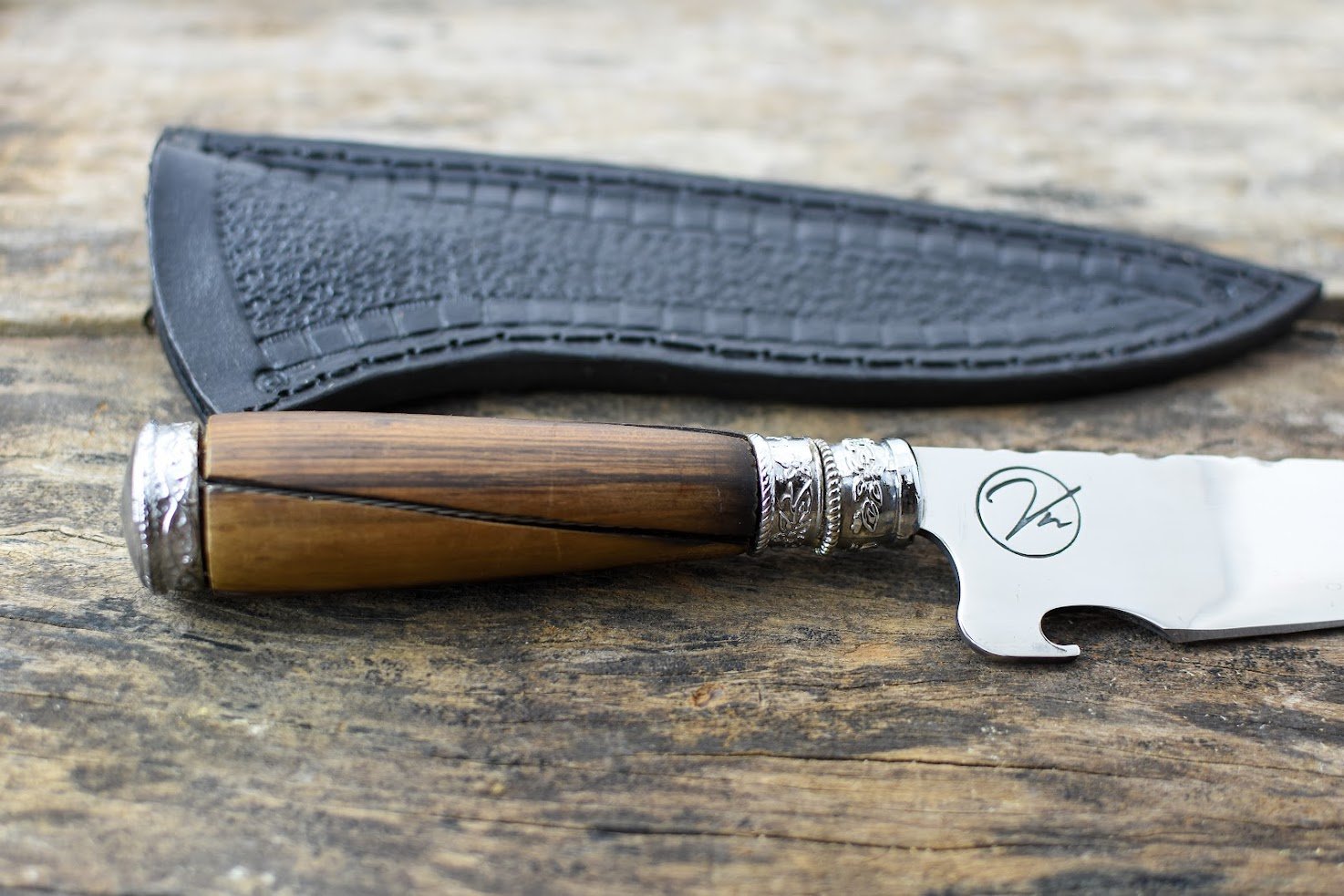 Bainha: Acompanha uma bainha de Couro Bovino Atanado legítimo, cuidadosamente costurada à mão, garantindo proteção e facilitando o transporte da sua faca artesanal.