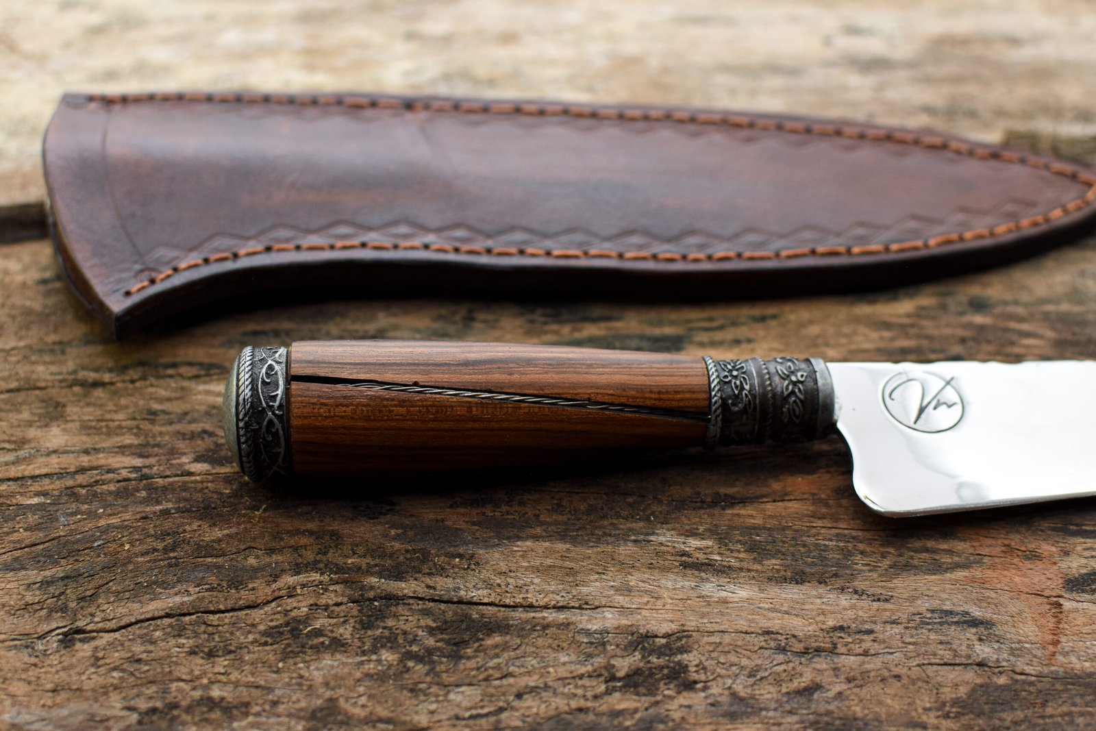 • Bainha: Acompanha uma bainha de Couro Bovino Atanado legítimo, cuidadosamente costurada à mão, garantindo proteção e facilitando o transporte da sua faca artesanal.