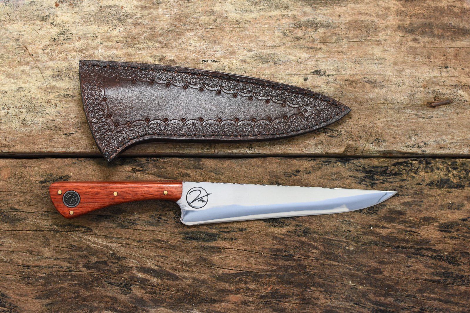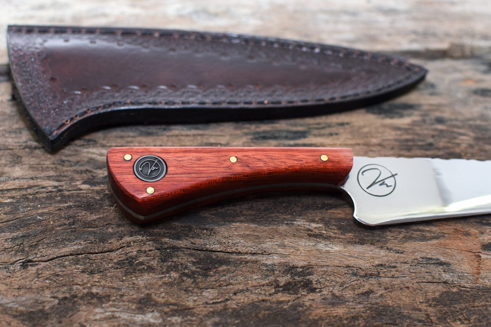 - Bainha: Acompanha uma bainha de Couro Bovino Atanado legítimo, cuidadosamente costurada à mão, garantindo proteção e facilitando o transporte da sua faca artesanal.