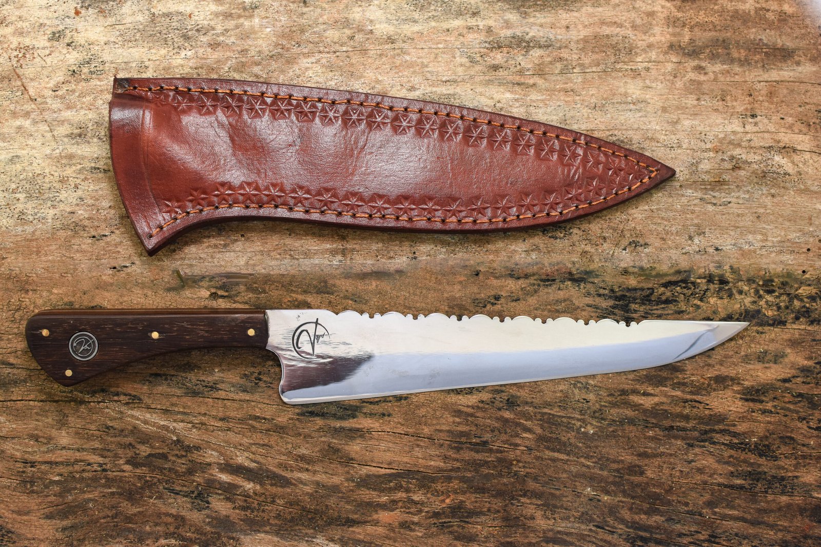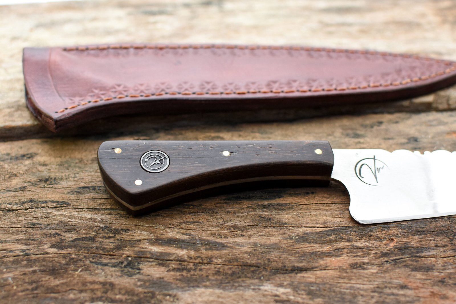 - Bainha: Acompanha uma bainha de Couro Bovino Atanado legítimo, cuidadosamente costurada à mão, garantindo proteção e facilitando o transporte da sua faca artesanal.